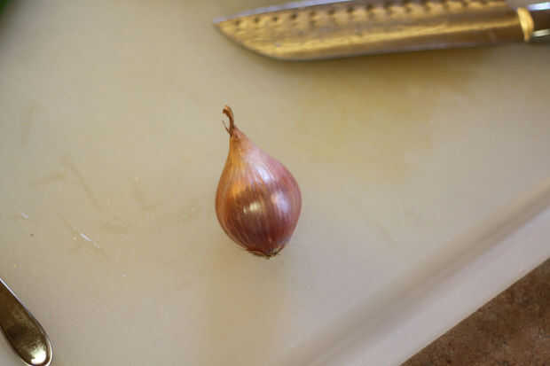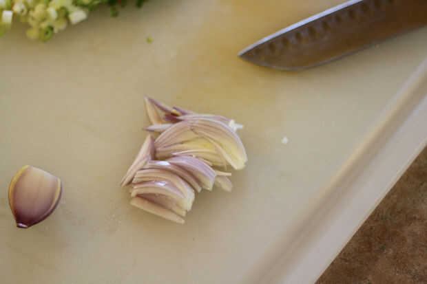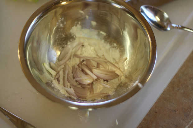 He picado una chalota hasta y había cubierto con harina. Fritos en un poco de aceite para hacer un precioso aderezo crujiente.