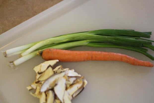 Añadido algunos picados encima cebollas verdes, finas rodajas de zanahoria y algunos de ésos setas del shiitake había rehidratado.