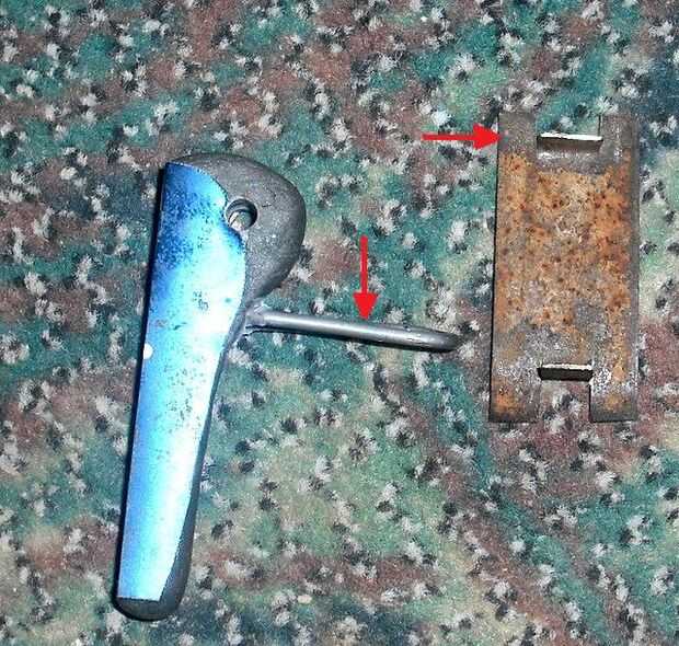La extensión del gatillo, de una percha de alambre, se colocó dentro de los dos agujeros. Un dispositivo mejor para usar un disparador sería un Ajustador de asiento de bicicleta. Su forma como un disparador, y es más resistente que un mismo hecho gatillo.