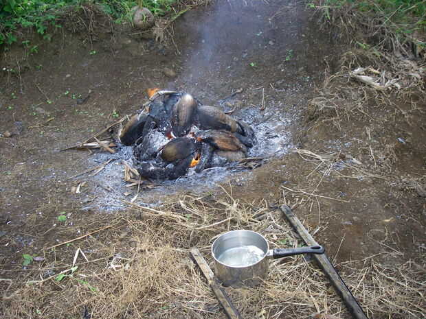 Había iniciado un fuego. Fue horrible. No pude conseguir las cáscaras de coco para quemar correctamente. Fumaba mucho y quiso arder. En México las hojas habían flameado hacia fuera y se quemó abajo a una buena cama de brasas en minutos. Supongo que eran mucho más secos que las hojas aquí en Maui.