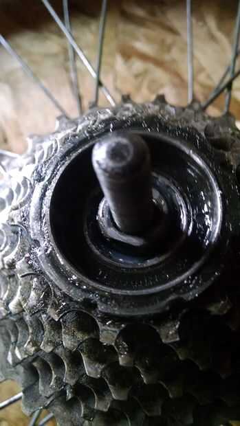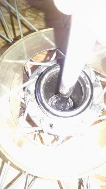 En lugar de pasar por la molestia de cambiar el eje o conseguir un disco nuevo, hice un arreglo rápido apilando unas arandelas en el centro, poner la rueda libre volver a mantenerlas en su lugar y entonces el embalar las bolas dentro junto con un montón de grasa. He añadido otra arandela entre el cono y la contratuerca para evitar que entre agua y suciedad. También tienes que ajustar el espaciado de las tuercas en ambos extremos del eje para que la rueda quede centrada.
