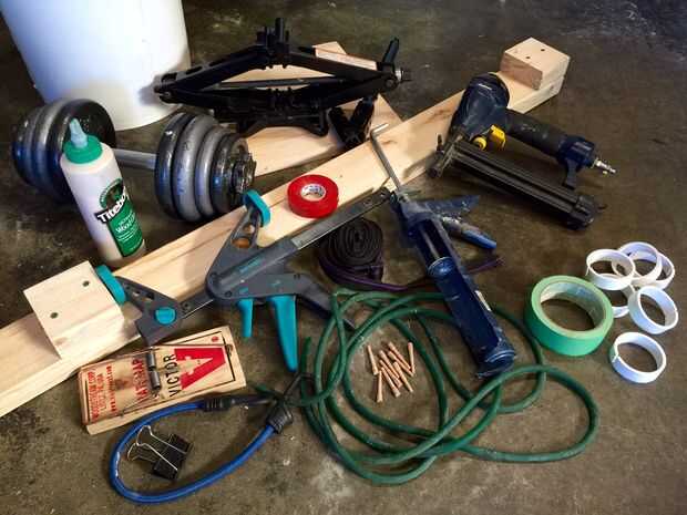 Madera real siempre parece tener un montón de pinzas ahí. Soy un carpintero aficionado y tengo el almacenamiento ni el presupuesto (abrazaderas son caras!), por lo que hacer con todo tipo de extraños montajes de sujeción. Afortunadamente, pegamento de madera moderna es increíblemente fuerte y aplicando grandes cantidades de presión puede ser contraproducente; Mattias Wandel ha demostrado que las uniones más débiles son aquellos en los que la articulación es hambre de pegamento, y los más fuertes son aquellos que tienen pequeños huecos (0.3 mm, ~1/64 ") llena de pegamento entre las piezas. Así que en realidad, es sobre todo una cuestión de sostener firmemente adyacentes entre sí las dos piezas de madera y dejar que el pegamento haga el trabajo.