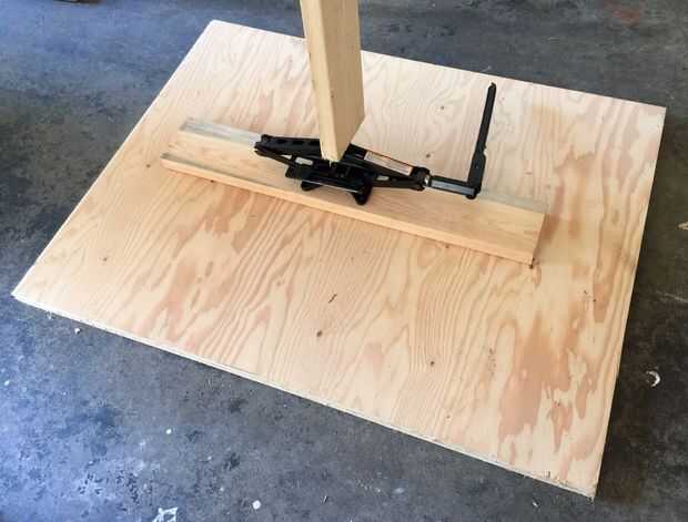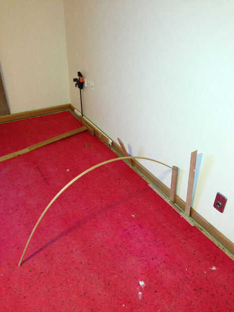 También se puede utilizar una pieza larga y estrecha de madera de la misma manera - la curva como un arco para ejercer presión hacia abajo. La tercera imagen proviene de manxm que usa este truco para pegar en madera rodapiés.