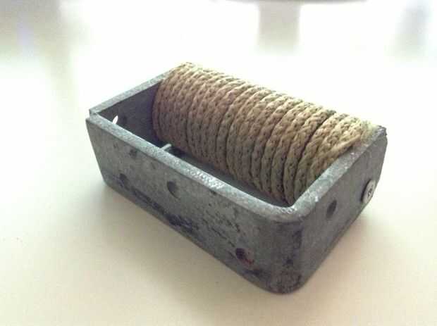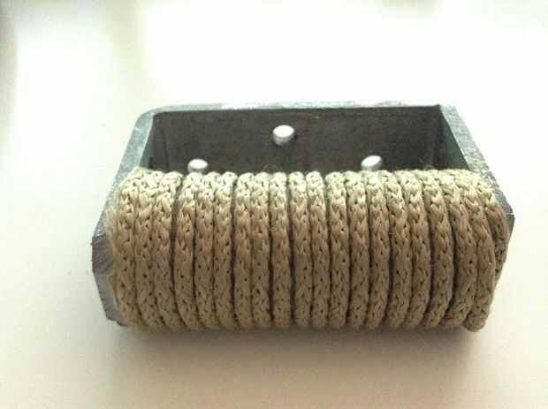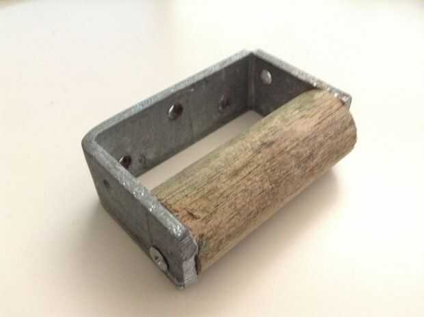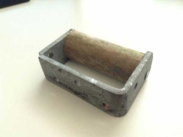 Fue creado con un simple 1" ancho de x 3 mm de espesor de acero de la barra que fue asegurado en un vicio y básicamente rompió en forma con un martillo. Luego había cortado un pequeño poste de madera a la medida de mi sierra de inglete y utilizado previamente perforados en el acero como agujeros a usar tornillos para madera para sujetar en su lugar. Entonces usa cuerda un viejo bolso de JD y envuelto, con un poco de pegamento caliente para mantenerla en su lugar!