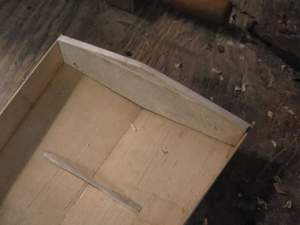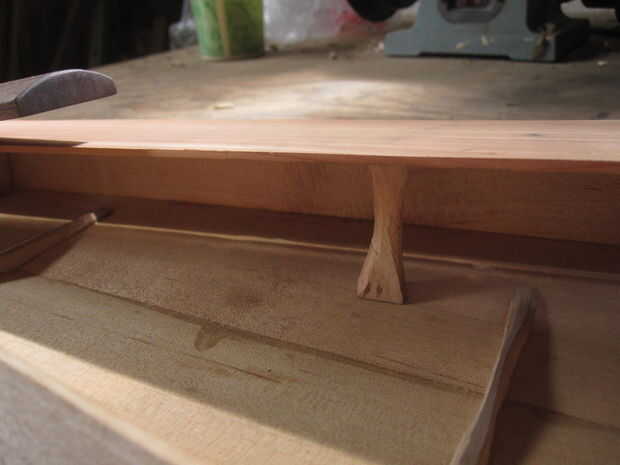 Para apoyar la articulación de pegamento a lo largo de la espina dorsal de la espalda, hice algunas costillas para ir en el interior de la parte posterior de la caja. Las costillas se redujo de otra pieza de arce