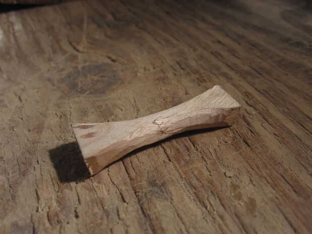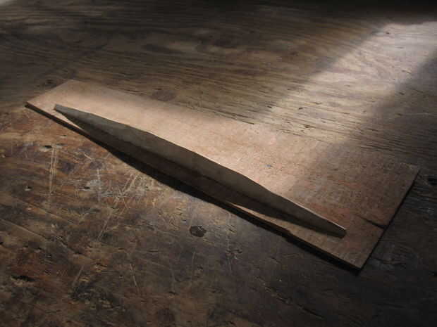 La parte posterior de la caja se hizo con dos placas simétricas, pegadas para formar una columna. Empecé con una tabla de maple de tamaño aproximado 0,75 "x 4" x 14 ". Arrancó la Junta Directiva de arce en dos paneles más delgados en la Sierra de mesa. La hoja que estaba usando sólo podría hacer un corte cerca de dos pulgadas de profundidad, así que hice dos pases (uno a cada lado) para cortar a través de la tabla de cuatro pulgadas de ancho. Sierra de corte de la hoja que me dejó con dos placas de 4 "x 14" de espesor aproximado 0.3" sujeta las dos piezas juntas y cortar la forma trapezoidal con una mano. Había planeado las tablas a mano a un espesor aproximado de 3/32", sobre todo apenas buscando en algún lugar entre un octavo y un 16 de una pulgada.