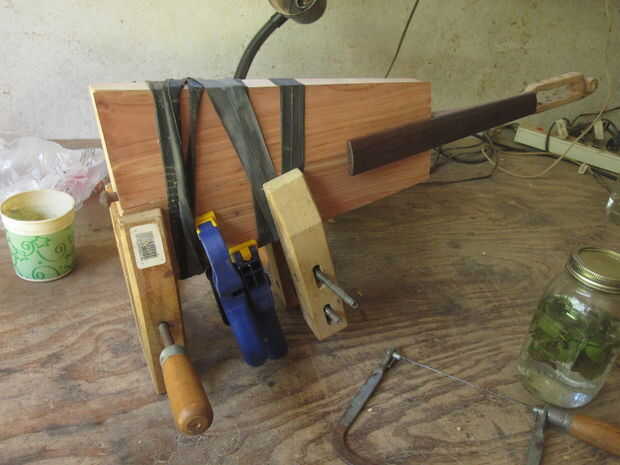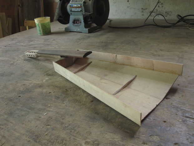 Leer sobre construcción de violín en el internet, luego en forma de una barra baja y alma fuera el mismo arce de pieza que el resto de la caja. Pegué la barra baja a la parte trasera del lado bajo de la la tapa armónica. Yo atrapada el alma hacer antes de pegar la caja cerrada. La sección de violines en Foxfire 4 también tiene fotos excelentes de la barra baja y mensaje de sonido.