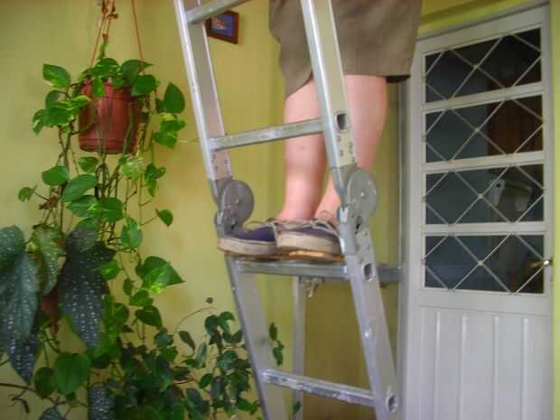 Hace algún tiempo compré uno de esos extraordinarios escaleras en cuatro segmentos. Es ligero, durable, fácil de transportar y almacenar, tiene todas las virtudes. Pero cuando tengo que trabajar dura más de unos minutos, mis pies están doloridos durante varias horas, porque los pasos son de sección cuadrada y no hay manera de reposar cómodamente sobre ellos, especialmente en el verano como ahora (vivo en el hemisferio sur) que tengo que usar zapatos ligeros. Junto a la escalera me he comprado un accesorio en forma de tabla, pero cambiando su altura todo el tiempo no es práctico. Sirve más bien para apoyar las latas de pintura, herramientas, etc.