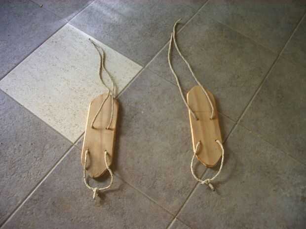 corté dos pedazos de madera vieja, hizo un tiempo atrás el techo de machimbre, ancho como mi pie y la longitud de un poco menos. La razón de esto es que pensé que sería más cómodo caminando, corroboró que el uso de los mismos. Doblé las puntas de ambos bosques, para adaptarse un poco a la forma del pie.