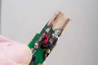 Después de algunos experimentos, encontré que necesitaba para hacer las huellas un poco elevada por encima de la placa de circuito. La forma más fácil de lo que fue para bajar la placa de circuito material moliendo lejos con un corte de la rueda en una Dremel. Esto también me permitió reducir los rastros de una mejor correspondencia con los rastros en el extremo macho. En la foto puedes ver el material de Junta de color beige que aparece cuando la capa superficial verde es tierra lejos. También se puede ver la polaridad correcta para el conector USB macho. El cable rojo (+) va a la izquierda como se muestra y el cable negro (-) va a la derecha.