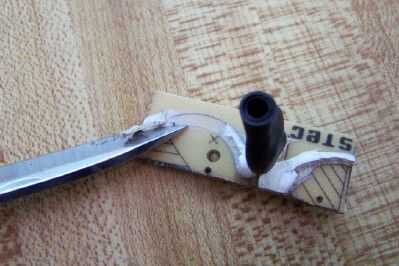 Esta parte de la placa de circuito celebrado los condensadores grandes se muestra en el paso 2. Un sellador se utilizó en el tablero, tal vez para mantener los condensadores de vibrar y hacer ruido. Lo recorte con un cuchillo.