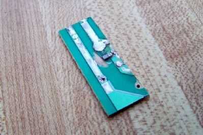 El lado de la placa de circuito con los rastros también tiene un diodo de montaje superficial pequeña que conecta los dos rastros. No fui capaz a desoldar, usé el disco de corte en una herramienta Dremel para romper la conexión del diodo a uno de los rastros. Observe el color bronceado que debería haber verde.