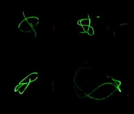 Este video muestra el dispositivo en acción. Ya que es oscuro, es difícil ver la escala, pero se proyectó unos 25' a través de la tienda. El patrón era aproximadamente 3' en toda la primera parte y unos 10' a través de la segunda parte con mayor volumen.