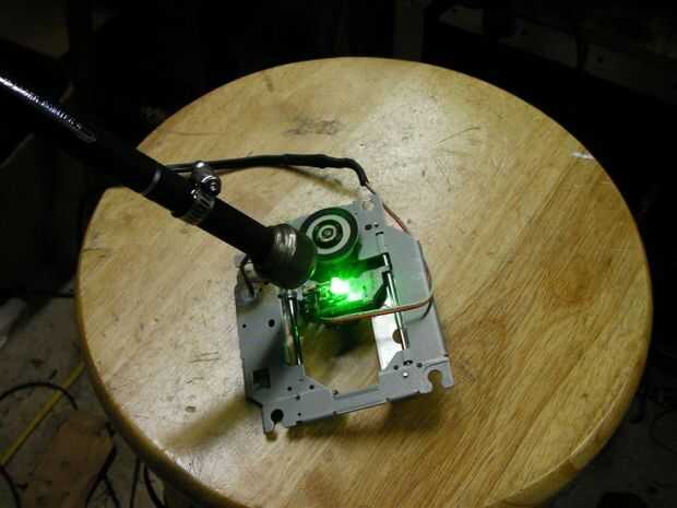 El corazón de este dispositivo es el enfoque de láser * de una unidad de CD o DVD. Cuando está haciendo su trabajo mundano en un reproductor de CD, se mueve hacia arriba, abajo, izquierda o derecha para mantener el laser centrado en la superficie del disco. Las lentes se montan en un conjunto de cables flexibles muy finos que requiere muy poca fuerza para mover. Los dos electroimanes son impulsados por un voltaje de DC y son atraídos o repelidos por dos imanes permanentes. Para este dispositivo, vamos a utilizar la salida de altavoz de un equipo estéreo para proporcionar tensión a la unidad de los electroimanes. Un hablante utiliza una bobina y un imán, por lo que es el mismo tipo de concepto.