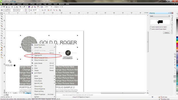 Esta es la clave para crear el archivo editable: desagrupar con click derecho del ratón o simplemente accesos directos es seleccionar el objeto y presione Ctrl + U