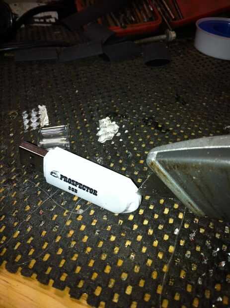 Aclaró este recinto de la impulsión del flash del USB por empujar el conector USB en un bloque de arcilla y un poco de PVC tubo sobre ella y luego Vierta el tubo de llenado con resina transparente.