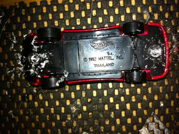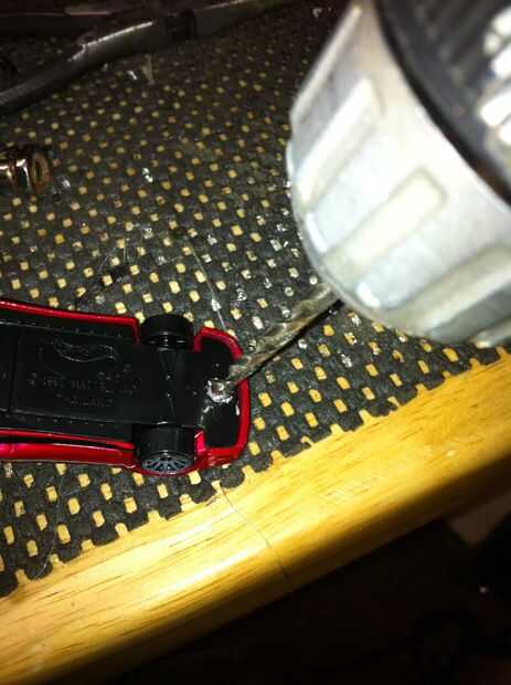 Desmontar el coche de las ruedas calientes perforando la cabeza de los remaches de ras con la parte inferior del coche. (Me gusta usar los coches con un fondo de plástico y tapa de metal).