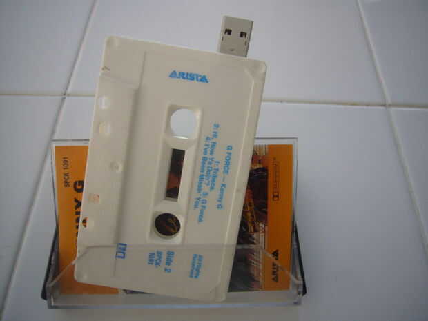 Hecho! Un cassette cinta USB flash drive - el caso también funciona como un soporte.
