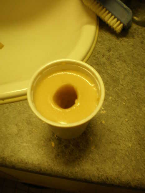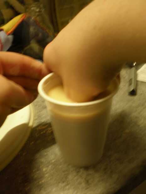 Primero necesita sacar su vaso de plástico. Dividir la copa en cuatro pedazos y verter una parte de quickform y 3 partes de agua a la taza. Mezclar durante unos cinco minutos. Aplicar parte de la mezcla para el pulgar antes de pegarlo en la taza .
