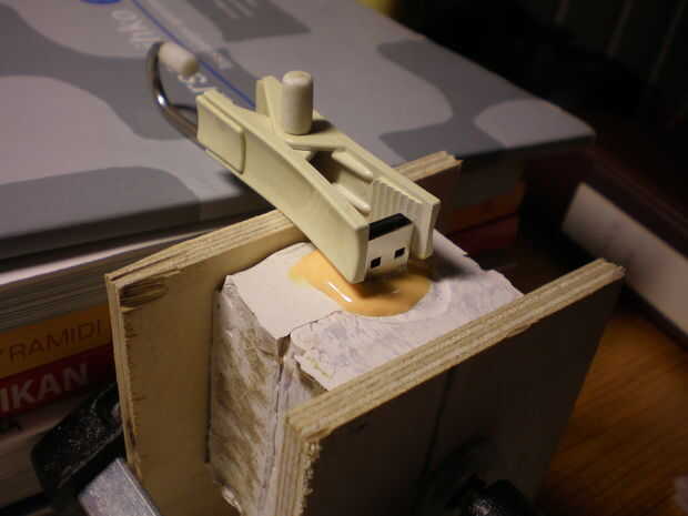 Las dos piezas de madera y construcción abrazadera mantiene el molde junto y utilizar la pinza de madera para guardar el usb en su posición.