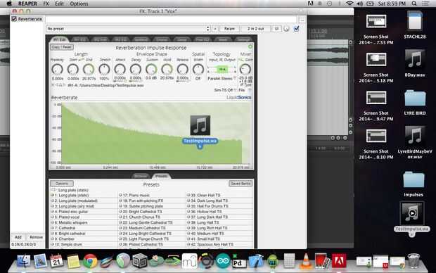 Es realmente fácil! A partir de ahí, trate de ajustar los diferentes parámetros dentro del plugin. Encontré que la ganancia era un poco demasiado alta, y tuve que muesca abajo a cerca de - 30dB para lograr el mejor sonido. El impulso que se utilizaba era de un espacio muy reverberante (dentro de un tanque metálico grande), así que había un montón de reflexión en. Además de eso, la pista vocal capas que estaba solicitando la reverberación que ya era bastante ruidosa.