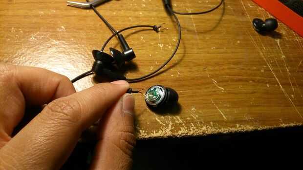 2. Introducir los cables de nuevo en el cuerpo de los auriculares en la oreja. Tendrá que utilizar pinzas para sacar los cables.