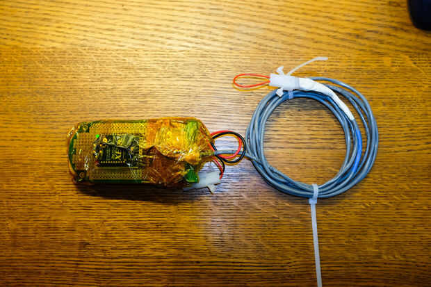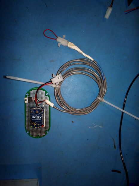 Mi nodo remoto (sensor) es bonito desnudo huesos, es solo un protoboard con un módem xBee a un lado una batería adherida con cinta al otro lado y un espoletas cable colgando de él. Más tarde planeo esta integración en un sistema más grande donde el xBee recibirá una señal digital de un microcontrolador, pero por ahora esto funciona muy bien para la prueba.