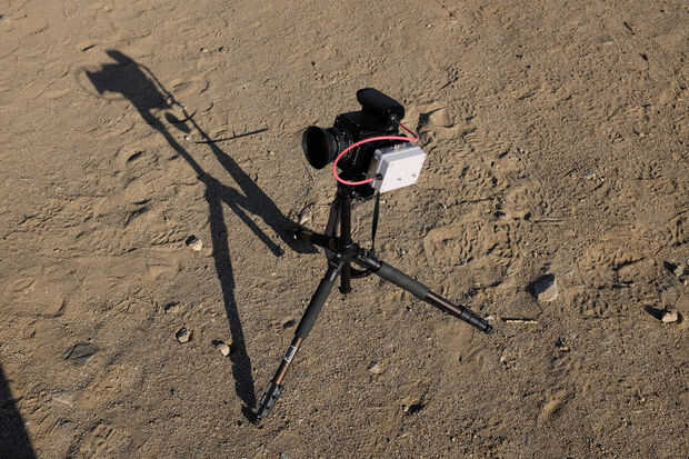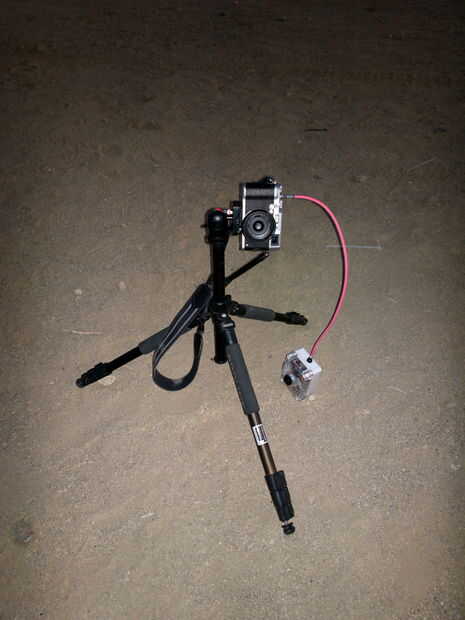 Posicioné el Pentax 645 sobre un trípode unos 50 pies lejos del riel de lanzamiento. El nodo de sensor remoto fue unido magnéticamente en el riel de lanzamiento y corrió un cable a un conector de bucle de retorno en el vehículo. Cuando el vehículo despegó si tirado sobre un pie de cable flojo y luego desconecta el conector loop-back accionar el obturador de la Pentax. Me sorprendió un poco por el retraso del sistema, el conector loop-back desconectado cuando el vehículo fue menor en el carril de lanzamiento que lo que se ve en la foto cerca de 6 pies.