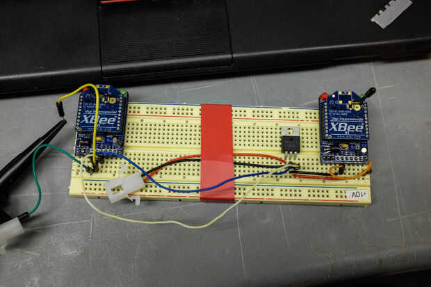 Utilizaré DIO7 (CTS) del módem xBee ya tiene un pin de salida de la cabecera de borde del adaptador xBee Adafruit. DIO7 no apoyo una resistencia de pull-up internas, tan en la clavija de entrada digital de nodos remotos que necesitaba agregar uno externamente.