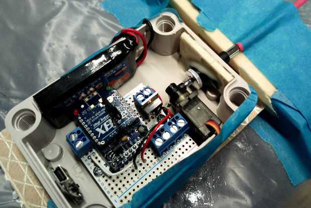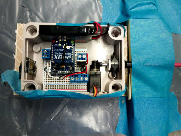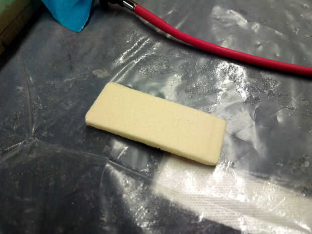 2. epoxi--tenía algunos epoxy ahí y la ayuda de los expertos sobre compuestos en el laboratorio CSULB cohete que me ayudaron con el laminado. Lo más importante que aprendí fue que no podía esperar para llenar el vacío entre el disparador "mango" y el recinto con el epóxido, el vacío era demasiado grande, por lo que necesitaba encontrar un relleno. El relleno que utilicé fue alguna espuma de alta densidad que fue muy fácil de moldear con una hoja de sierra y lija, pero una pieza similar en forma de madera o plástico habría funcionado igual de bien. Moldeadas de espuma en forma de herradura que yo podía deslizarse entre el cable disparador "mango" y el interior del recinto. Cuando llegó el momento de bond me enjabonó el pedazo de hule espuma con epoxy 5 minutos y deslizarse entre la pared de la caja y el cable disparador "manejar".