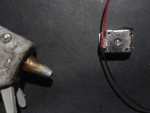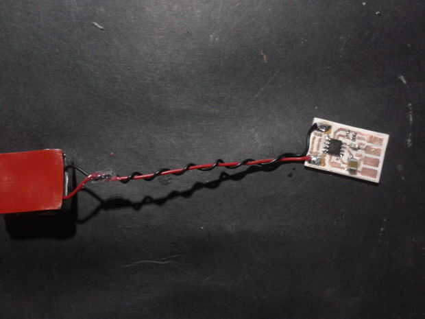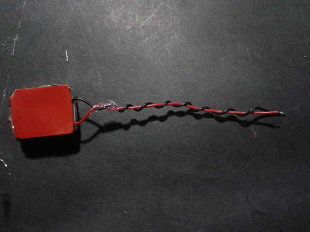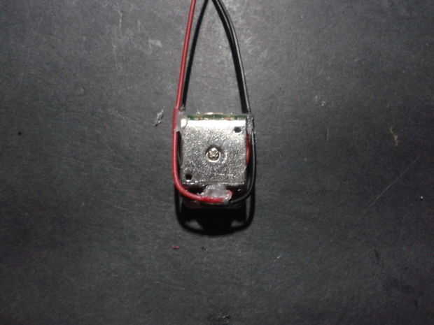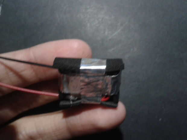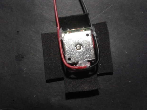 Entonces utilicé una pieza de forma cruzada de espuma para cubrir el transductor y protegerlo. Entonces usé algunas cintas de aluminio para mantener en su lugar el foami. Luego colóquese un pedazo de cinta de doble cara en el otro lado del transductor y los hilos de la trenza. Ahora usted puede soldar el transductor a la Junta de amplificador. Repita este proceso dos veces, usted necesitará esto.