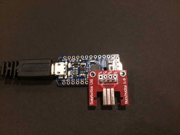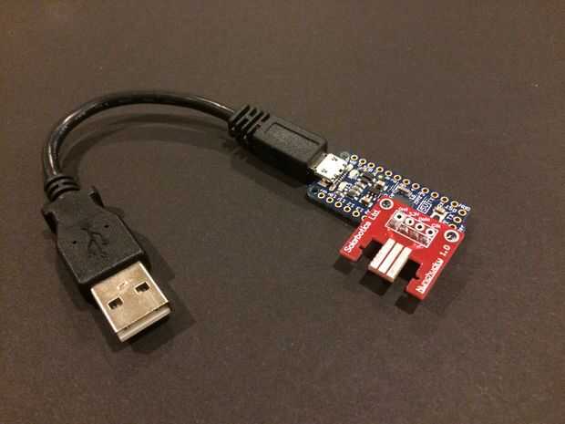 Arriba se muestra un cuadro de nunchucky soldada a la baratija Pro. Es importante asegurarse que la tarjeta de interfaz de Nunchucky es soldado y orientado correctamente con respecto a la baratija Pro.