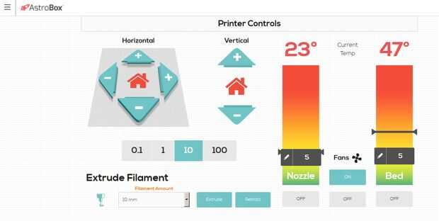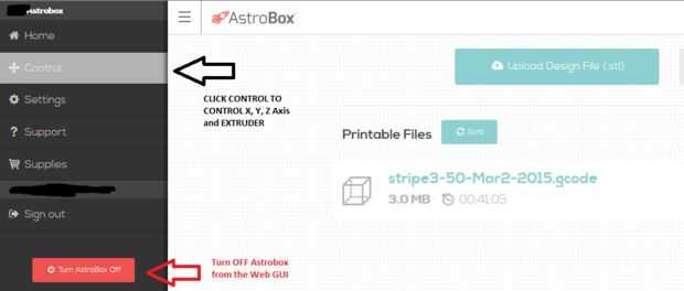 Después de iniciar el Astrobox UI, usted también puede hacer clic como se muestra para los controles de Control X, Y, eje Z y la temperatura de extrusión etc. (equivalente a pronterface).