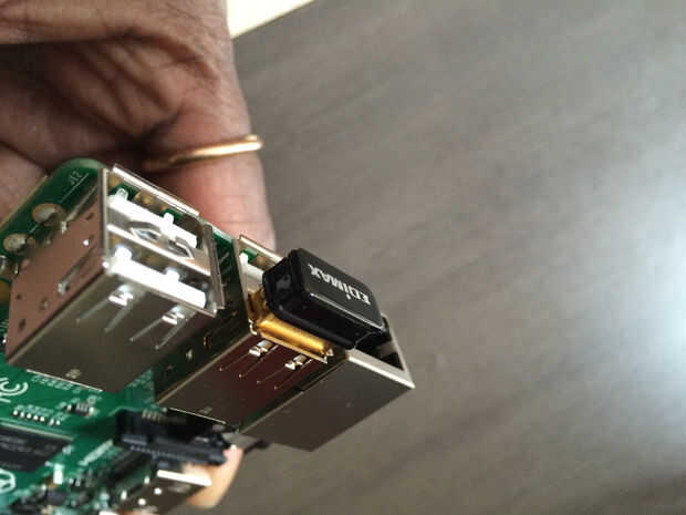 Instalar a adaptador Wifi y tarjeta SD como se muestra en Raspberry Pi y conecte a la energía. Espere 5 minutos y déjelo arrancar y en línea.