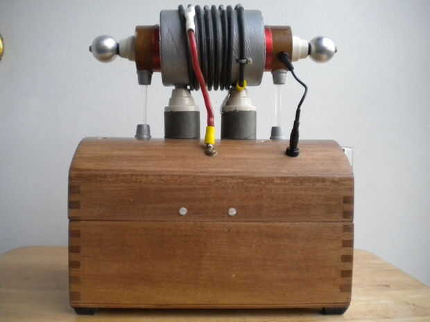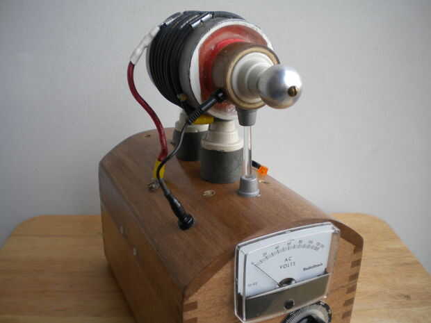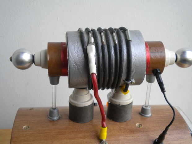 He montado horizontalmente en la secundaria, desconectado de tierra y luego tapa los extremos con globos de descarga de aluminio atornillados a los aisladores de cerámica. Por último, utilicé una bobina concéntrico acoplada para reemplazar el primario de la crepe. Una vez que el TC se completó, la construcción restante fue intuitivo.