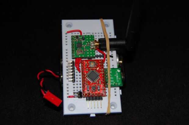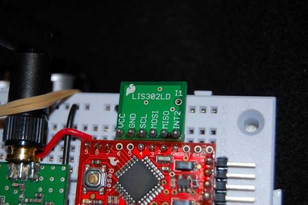El transmisor se basa en el microcontrolador avr168 de Atmel. El tablero rojo conveniente con la 168 es una placa arduino con regulador de voltaje y el circuito de reset. El acelerómetro está conectado al avr con bus i2c golpeó poco, y la tarjeta inalámbrica está conectada con hardware SPI, (interfaz periférica Serial).