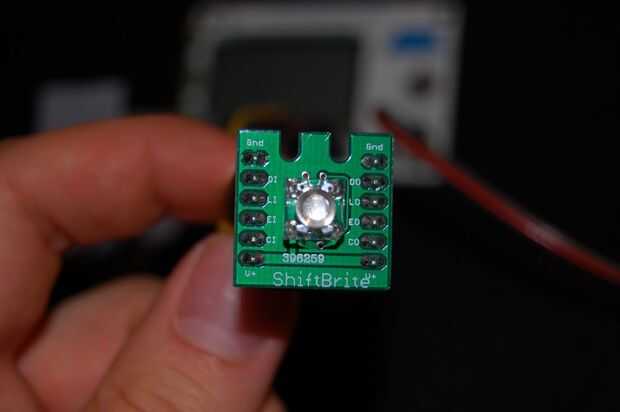 El shiftbright es un controlador de modulación de anchura de pulso led rgb que acepta un comando de 4 bytes que es trabado en y entonces trabado hacia fuera en los pines de salida. Muy fácil de conectar en serie. Solo cambio muchas palabras de comando, y el primero cambió de puesto hacia fuera va a terminar en el último LED conectado en la cadena de Margarita.