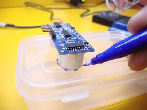 Para la caja del transmisor, hacer agujeros para sensores de ultrasonidos, LED e interruptor.