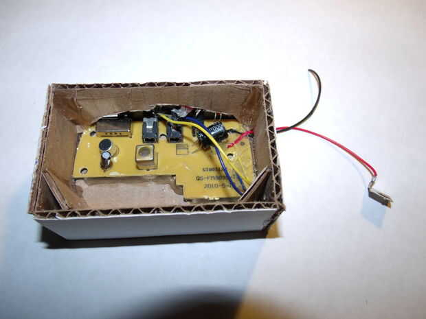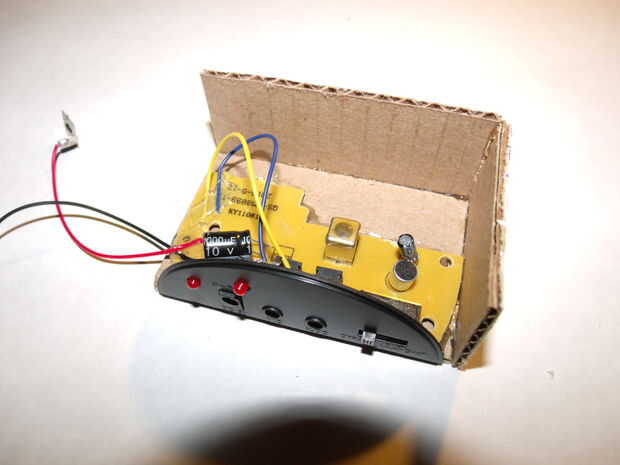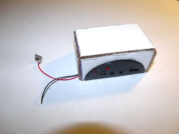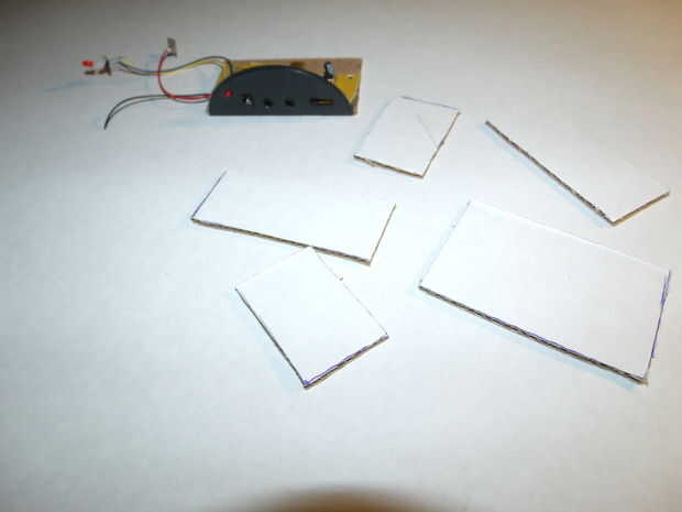 Medir y construir una caja para la placa. Un lado necesita un corte en él la placa de la cara. Es una tarea bastante sencilla, así que siga las fotos. Usé pegamento caliente para pegar la caja juntos y unos los pedacitos de cartón para reforzar los bordes.