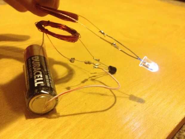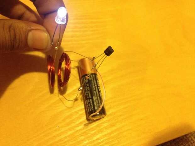 Toma el golpecito de la bobina B y conecte al extremo positivo de la batería. Conecte el extremo negativo de la batería en el emisor del transistor. Ahora si trae bobina A con el L.E.D cerca de la bobina B, la L.E.D se ilumina!