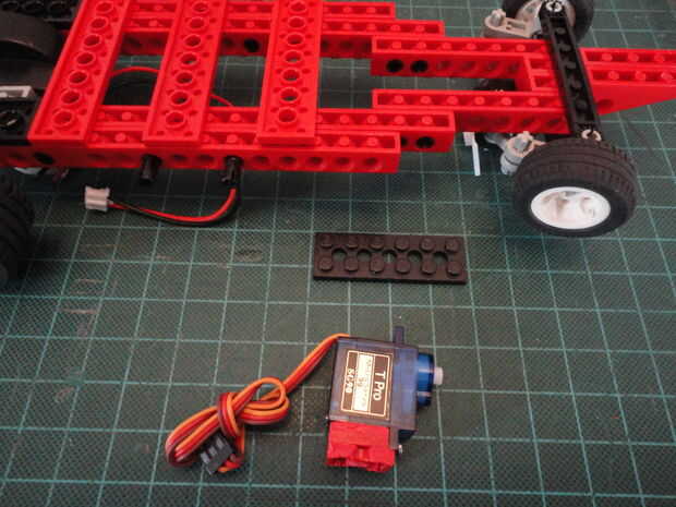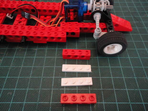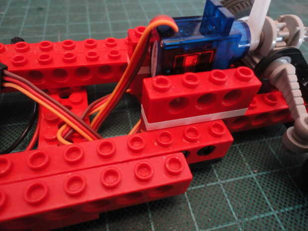 Foto 12. Instalar el ladrillo de 1 x 4 montado y placa de 1 x 4 al lado del servo tal como se muestra.