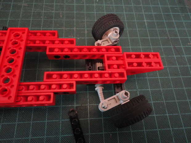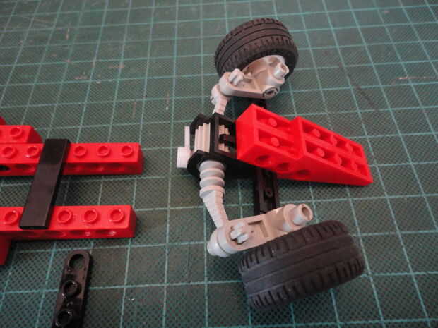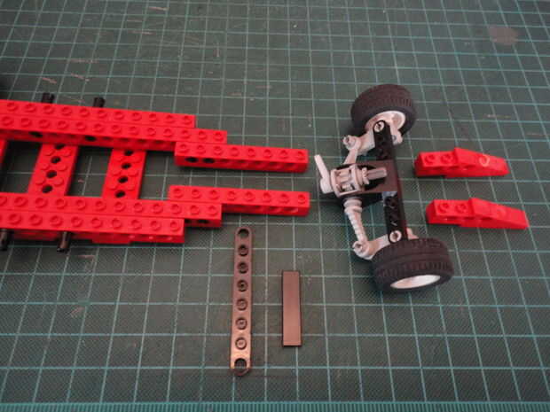Foto 1. Preparar sistema de dirección delantero montadas ruedas delanteras. Dirección Rack soporte 8 pin placa (#4262). Y 1 x 4 piso azulejo (#2431).