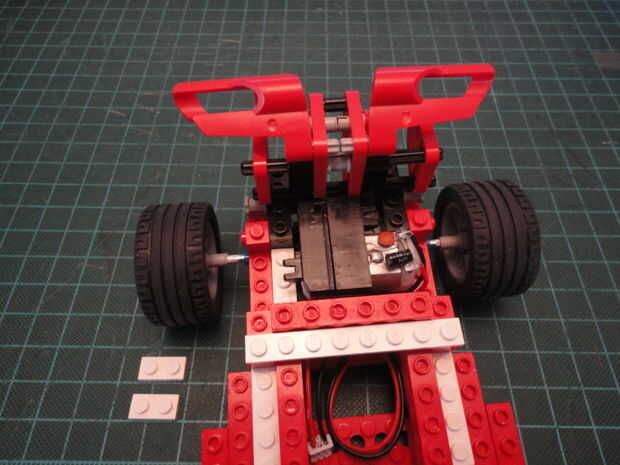 Foto 5. Inserte el brazo de elevación 3 x 3 (#32249) en cruz del eje en ambos lados como se muestra.