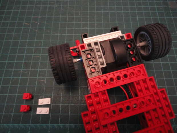 Foto 18. Instalar aleta alerón trasero en el coche que necesitábamos 1 no. 1 x 6 Plate(#3666), 2 Nº-Technic Brick Angular 1 x 1 (#4070) y 2 núms. - Plate(#3023) de 1 x 2.