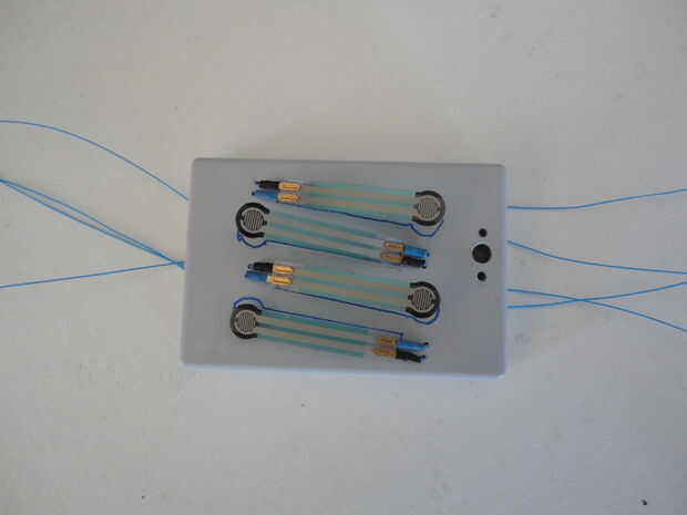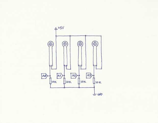 Entonces, resuelto la envoltura del alambre de los FSRs. Asignado las vueltas de alambre que vino tiene calor negro encogimiento envuelto va a 5V. (Véase el esquema en el cuadro 5). Soldar estos cables a cabezal macho 4 pines.