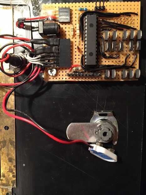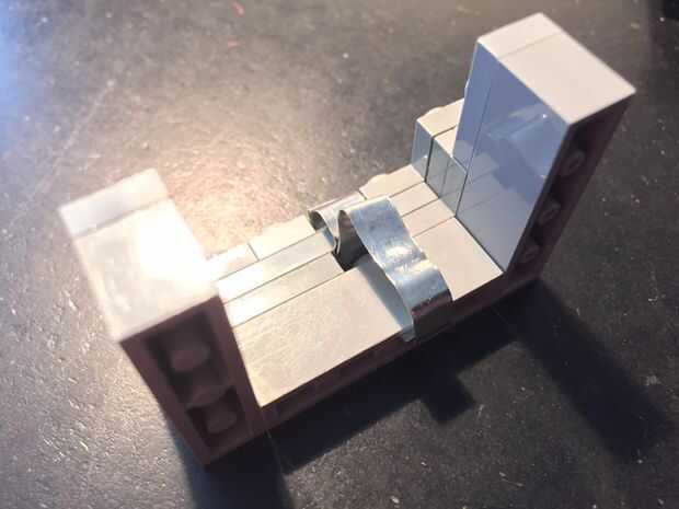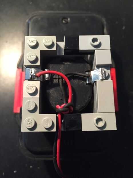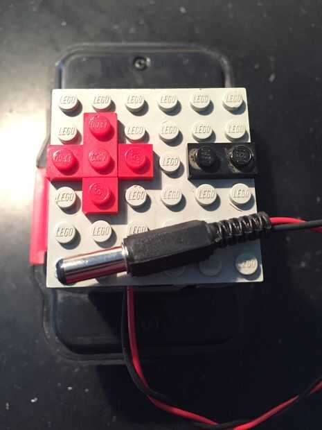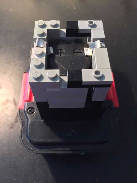 Para la batería, hice un adaptador de LEGO. Se ajusta sobre la parte que normalmente se desliza en el taladro y hace las conexiones eléctricas. La pieza LEGO es muy fácil de hacer. Basta con añadir 2 pedazos pequeños de metal, que hacen contacto con los terminales de la batería. A continuación, soldadura de 2 alambres a él y conectar a un conector de barril (centro positivo). Esto va dentro del enchufe en el perfboard. El montaje encaja perfectamente en el cuadro que hicimos anteriormente.