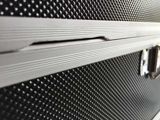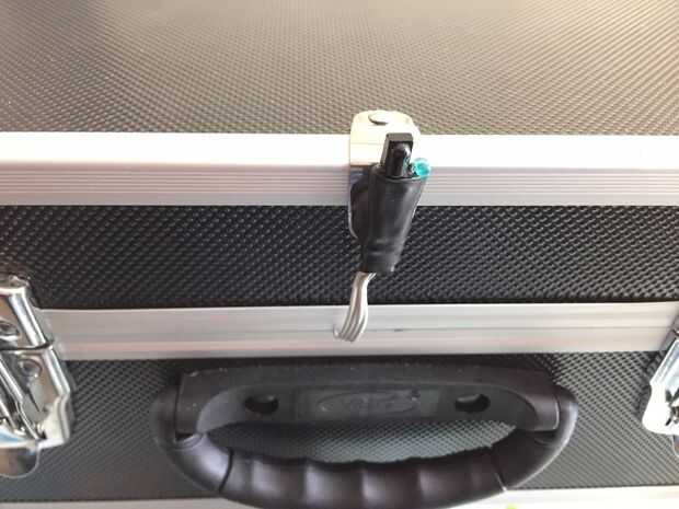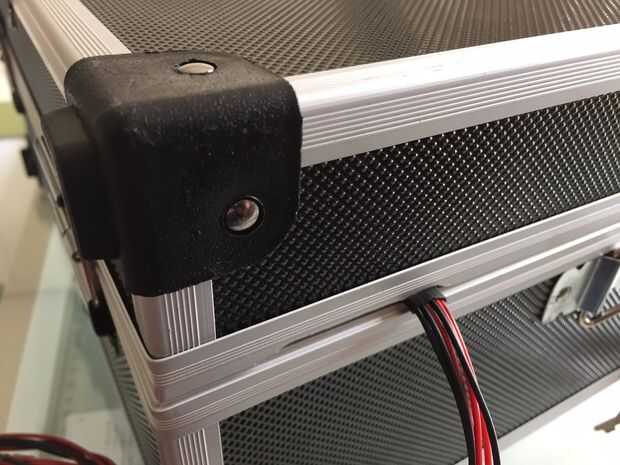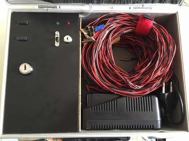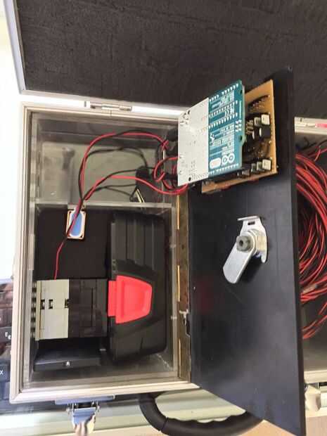 Para el caso, elegir modificar un tronco que compré en mi ferretería local. Era del tamaño perfecto para mantener la batería, cargador de batería, circuito de control y cables. Hice una pequeña caja de plexiglás para mantener la batería y el circuito firmemente dentro del tronco. Esto evita que la batería deslizando alrededor y me dio la oportunidad de añadir un pequeño cuadro con los LEDs e interruptores (2 polos y llave). La tapa es conectada a la caja con una bisagra y sujeta por un candado. También he añadido una pequeña cavidad para albergar el cinturón que lleva que vino con el caso.