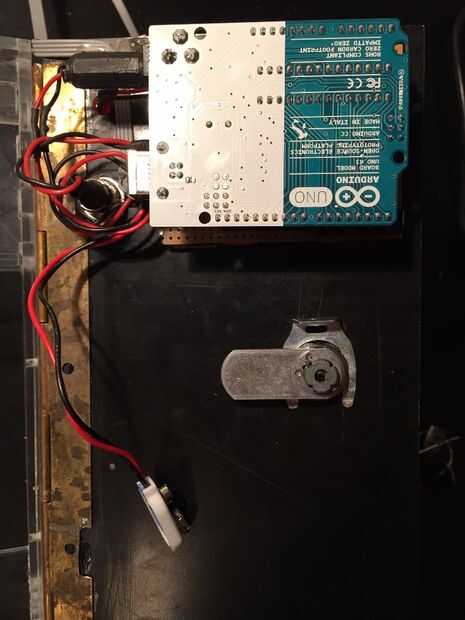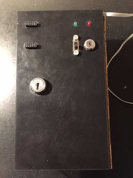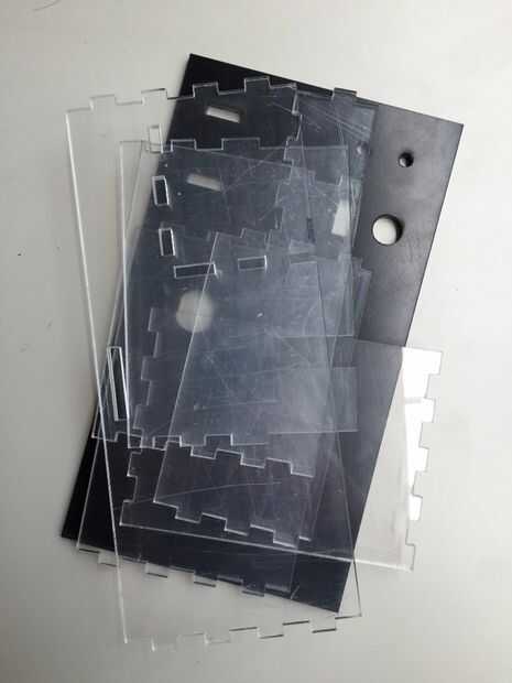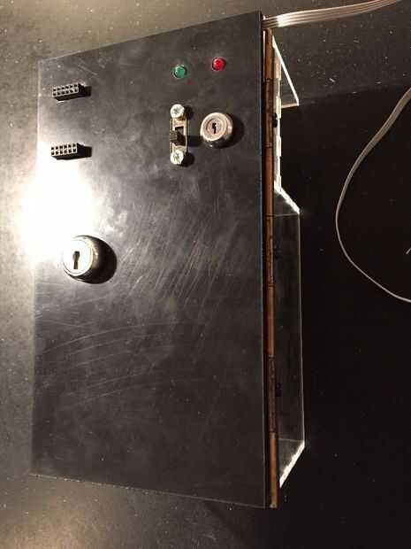 Incluí los archivos de inventor y los archivos de la lasercutter. Hice mía en un FabLab: FabLabXL en Bruselas, Bélgica. Las formas también podrían cortar a mano y en madera. Después de cortar las piezas, unir todo. A continuación, agregue el circuito (y arduino), interruptores y LEDs en la tapa (pieza negra). Inserte el cierre en la tapa, usando alicates de anillo de cerradura. Lo único que dejó hacer es conectar la tapa a la caja con una bisagra (utiliza pegamento para fijarlo). Ahora pegue esta Asamblea en el tronco. El labio de la cerradura debe encajar perfectamente en el agujero en el lado de la caja.