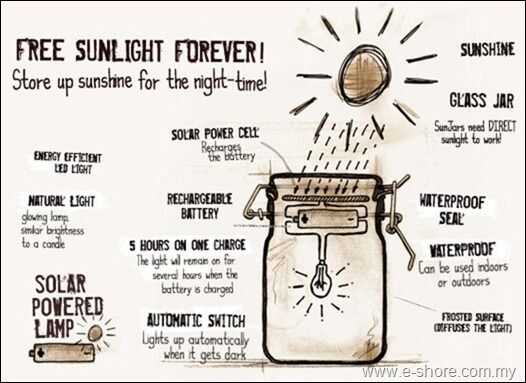 Básicamente, tengo un tarro de Sun, que es una lámpara de energía solar, es como podría almacenar la luz del sol en la jarra. Cargar durante el día y utilizar la luz en la noche. (usted puede Google "Tarro de Sun" para obtener más información)