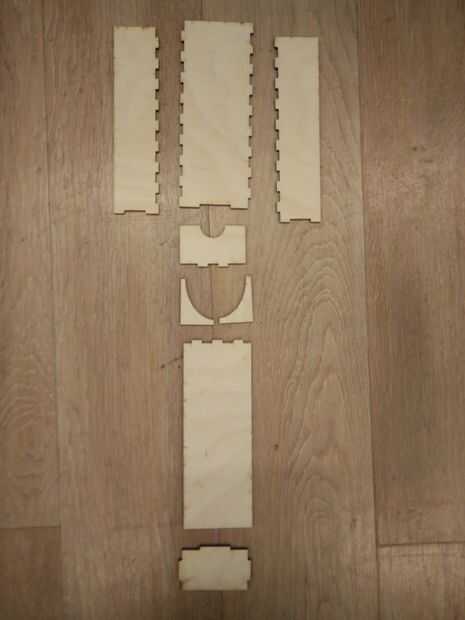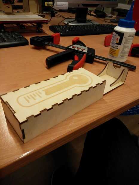 Se me ocurrió el siguiente diseño; una caja de 18 por 7 x 4 cm (hecho de madera contrachapada de 3mm) con un cajón para que el Arduino que pueda consultarse fácilmente.